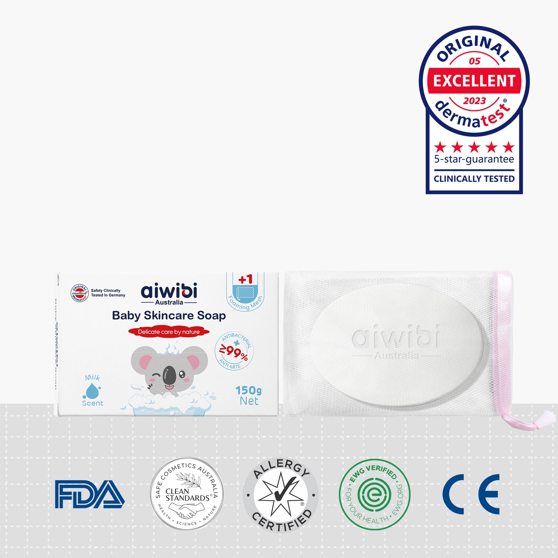 Speically crafted for sensitive skin, Aiwibi's plant-based baby skincare soap gently cleanses dirt, bacteria, and excess oil. Enriched with natural extracts, it produces a luxuriously dense and thick foam that deeply hydrates, leaving your baby’s skin soft, smooth, and irritation-free,while delivering ≥99% aiti-bacteria and anti-mite protection. Perfect for the whole family, our Aiwibi Skincare Soap works for hand-washing, bathing and face-washing. Plus, each box includes a self-provided foaming net for effortless foaming!