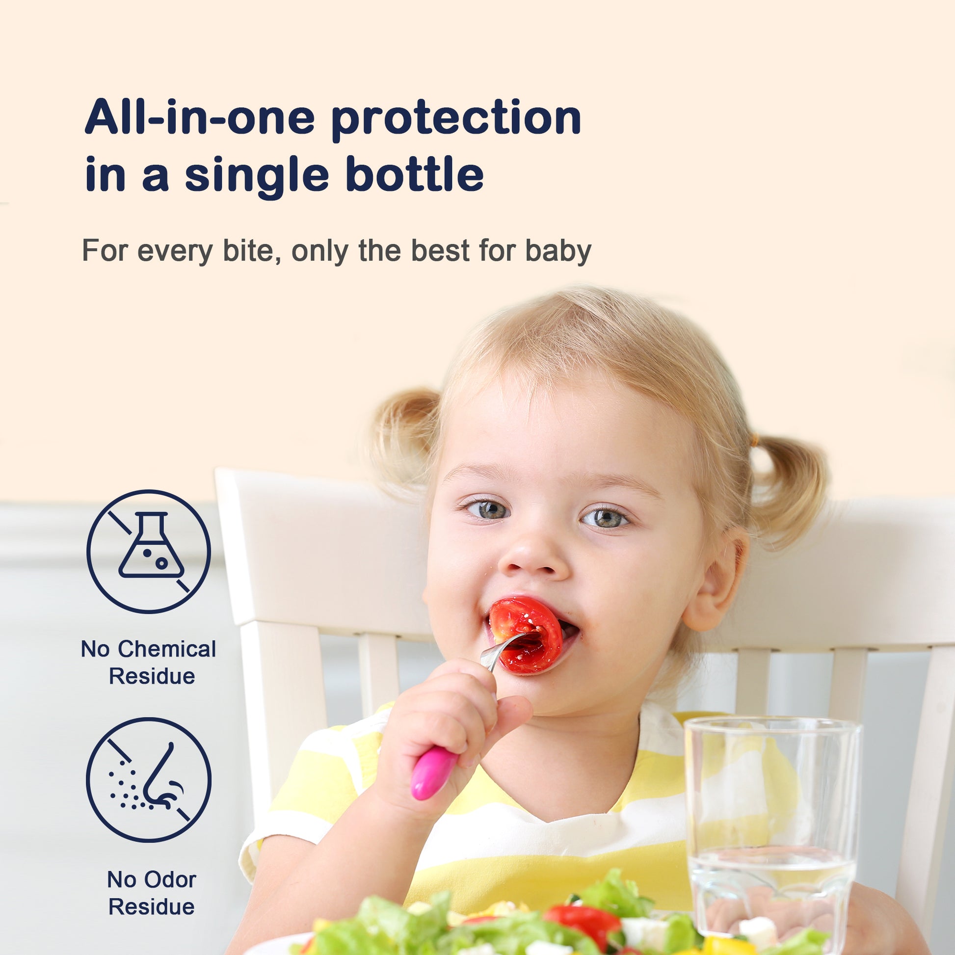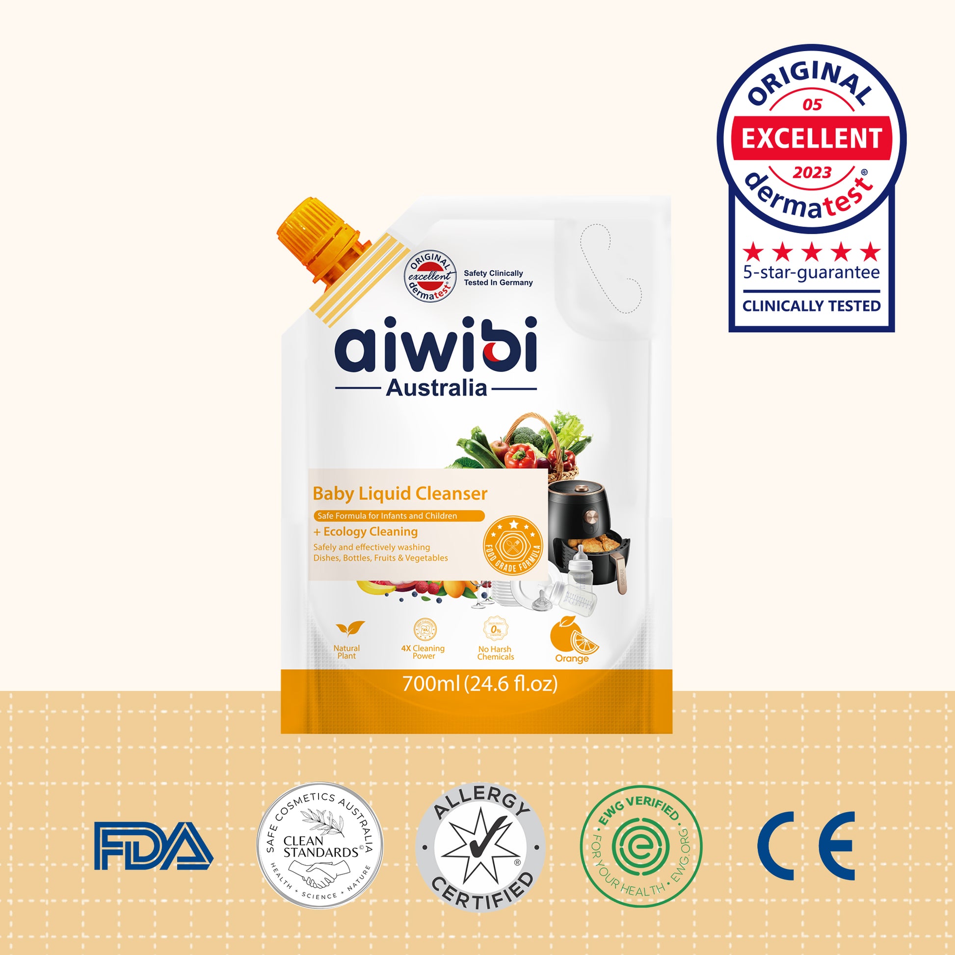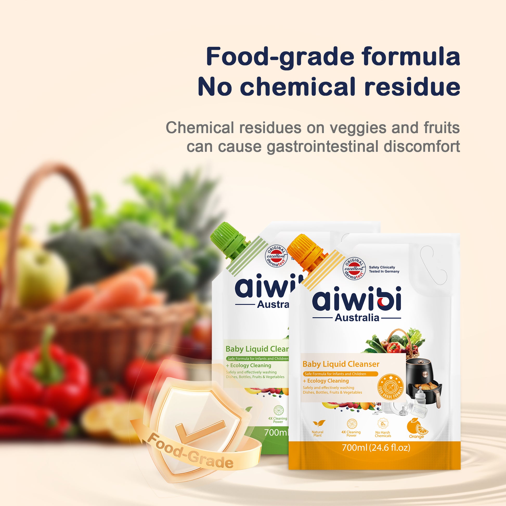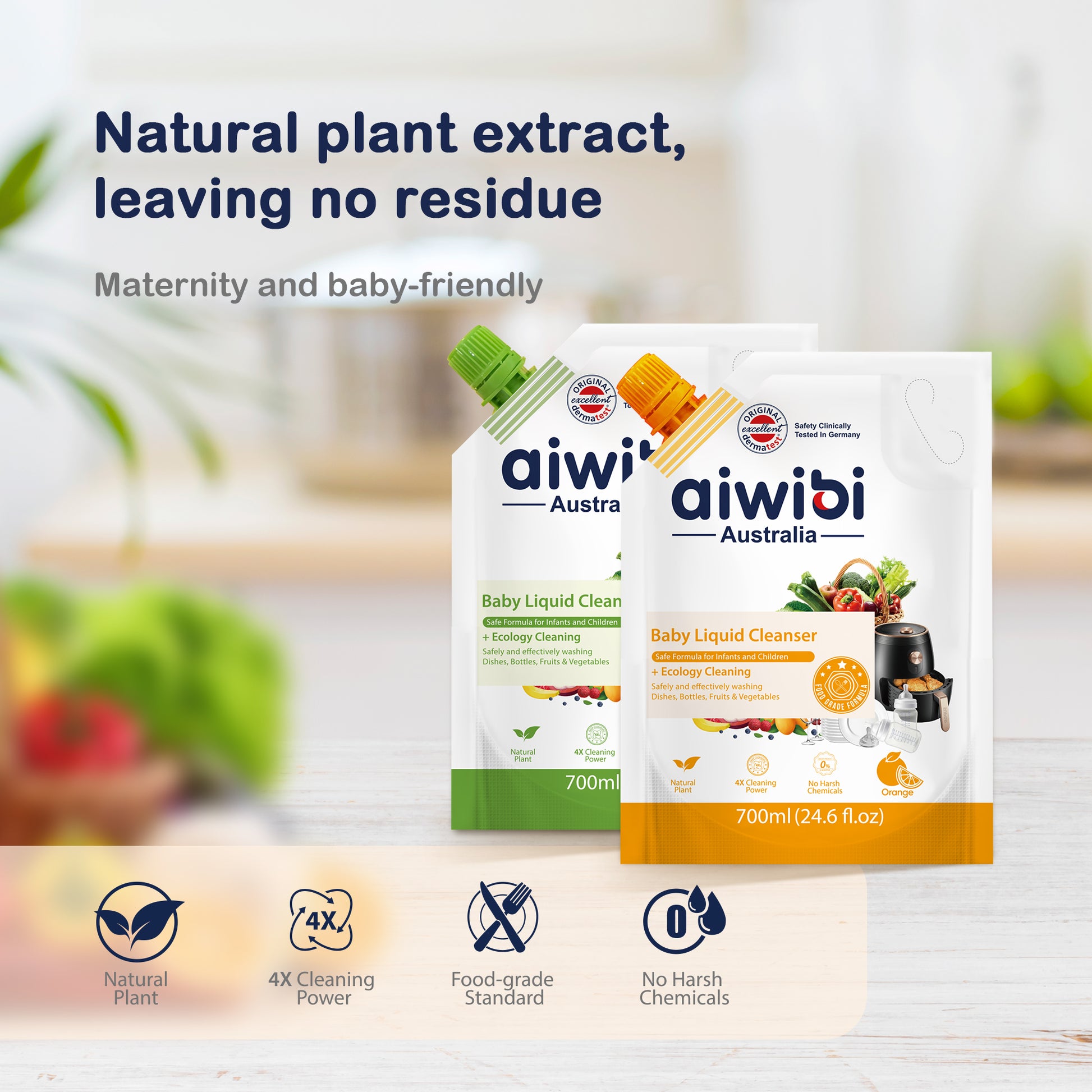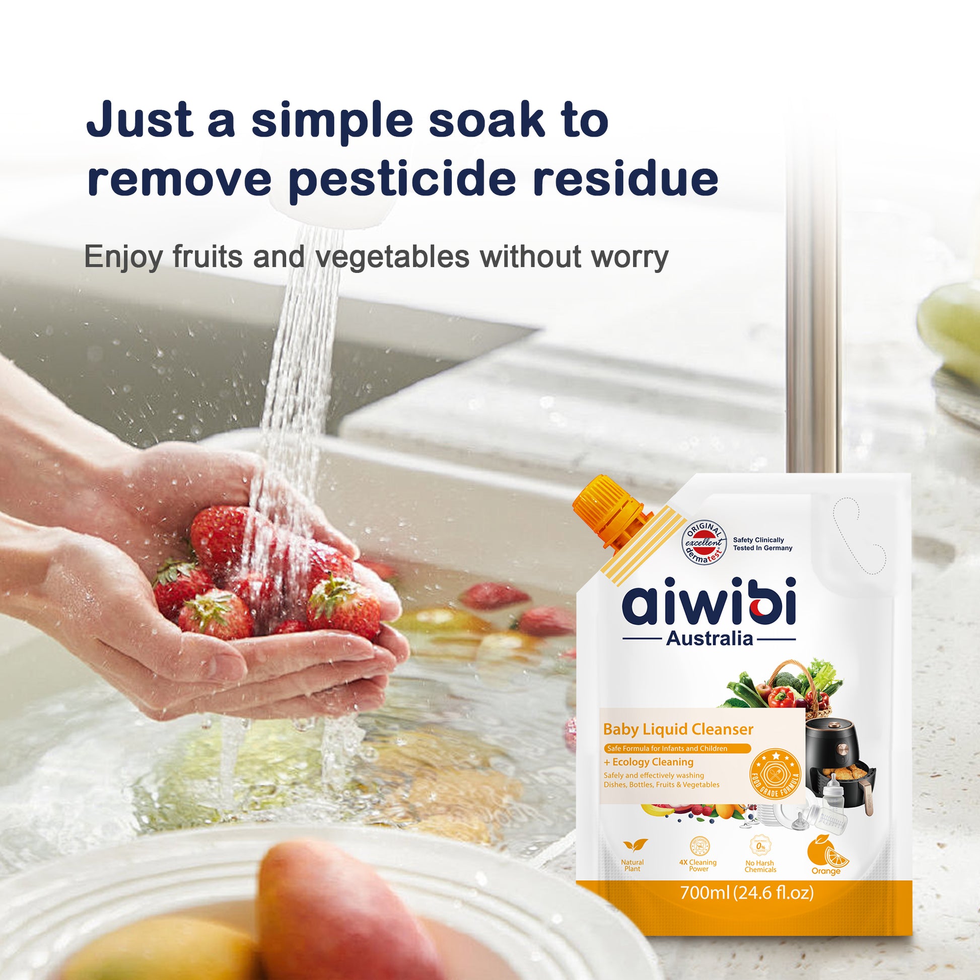 Aiwibi Liquid Cleanser has super-strong cleaning power and can effectively remove pesticide residues on the surface of fruits and vegetables. At the same time, it also has a remarkable cleaning effect on milk stains and oil stains on baby bottles and tableware, ensuring thorough and safe cleaning every time.