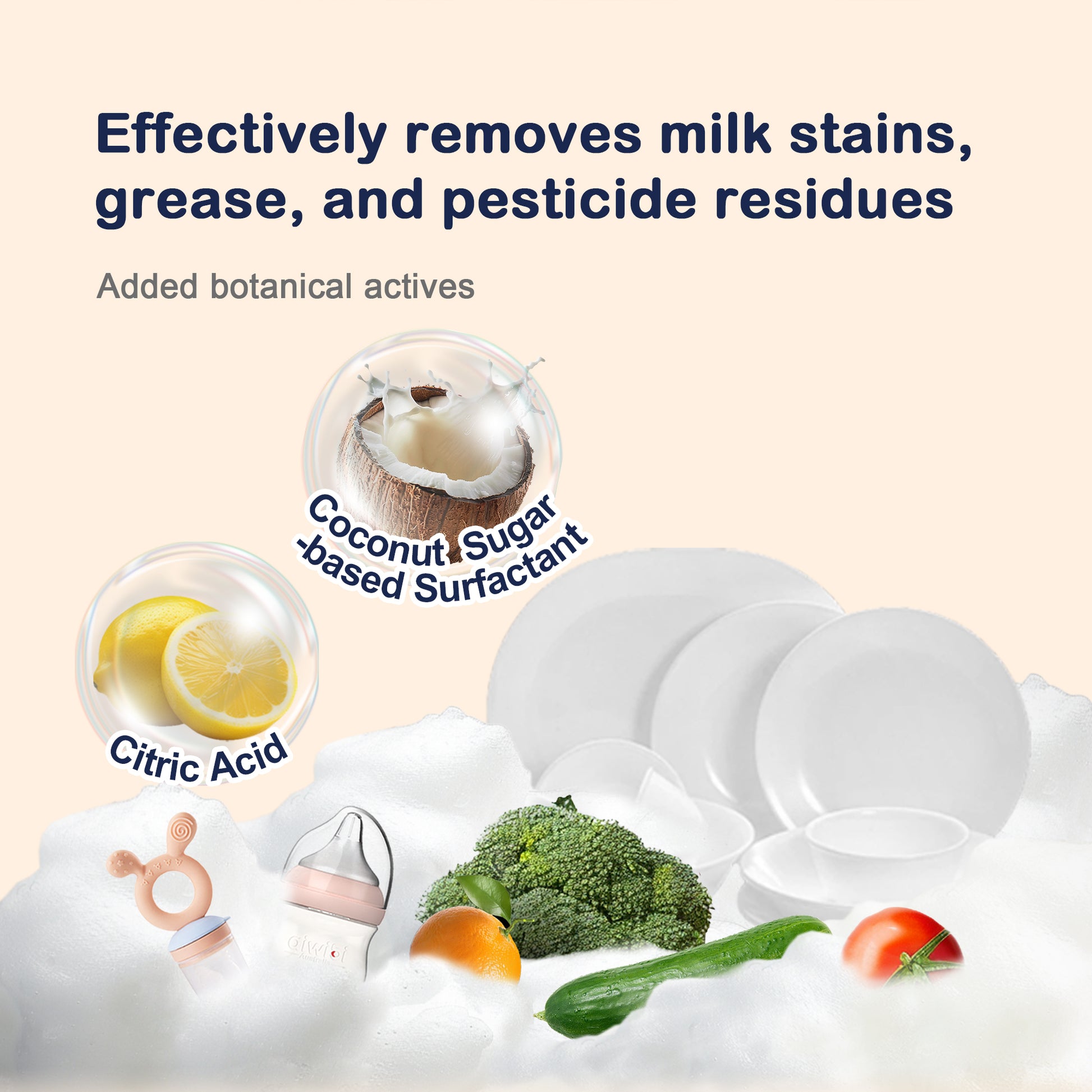 Aiwibi Liquid Cleanser uses natural plant extracts as its main ingredients, which meet food-grade standards. These ingredients are mild and safe, suitable for cleaning baby bottles, tableware, and daily fruits and vegetables.